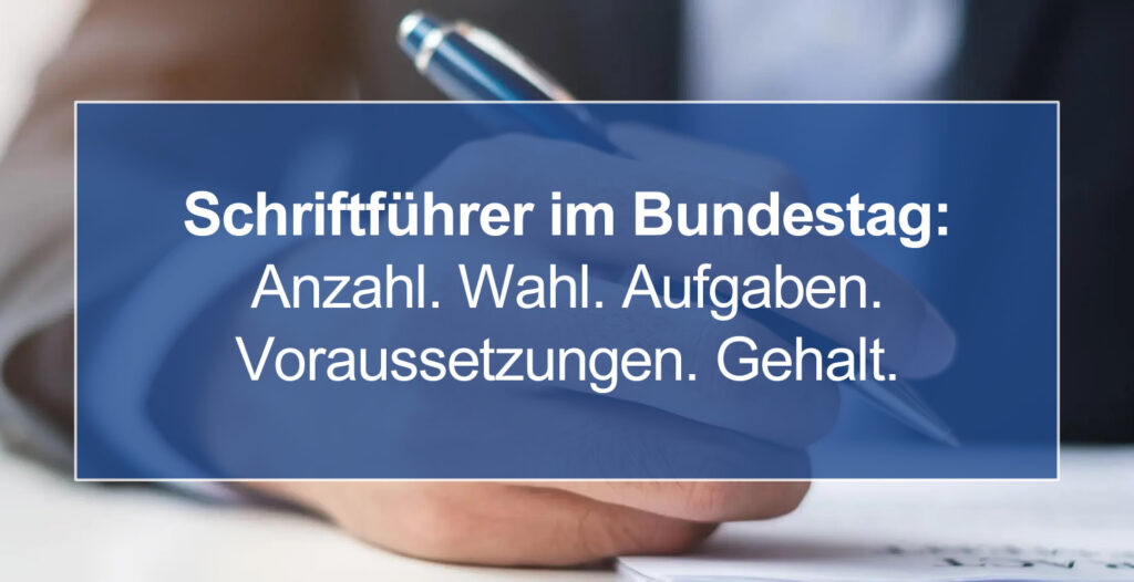 Schriftführer im Bundestag unterstützen den Bundestagspräsidenten / die Bundestagspräsidentin bei den Plenarsitzungen. Wenn Sie sich darunter nichts vorstellen können, erhalten Sie in diesem Artikel alle wichtigen Informationen. Wir erklären Ihnen, welche konkreten Aufgaben ein Schriftführer hat. Darüber hinaus erfahren Sie, wie viele Schriftführer es derzeit gibt, wer diese Position im Bundestag inne hat und wie…WeiterlesenSchriftführer im Bundestag: Anzahl. Wahl. Aufgaben. Voraussetzungen. Gehalt.
